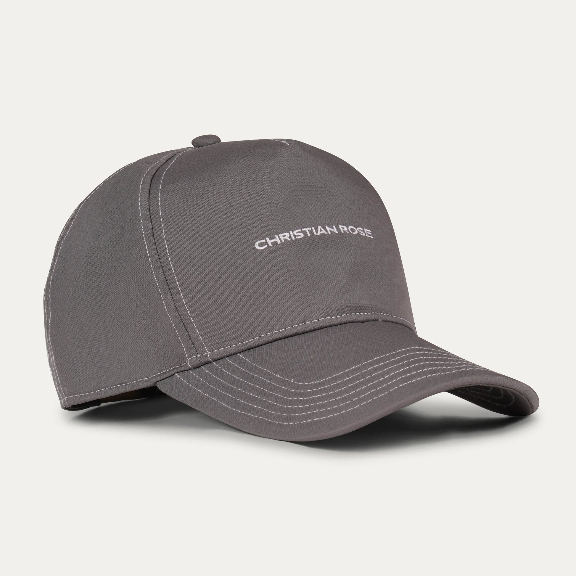 Crisp Contrast Stitching: The bold white thread lines highlight the structured panels of the cap, adding depth and distinction to the cool grey base.