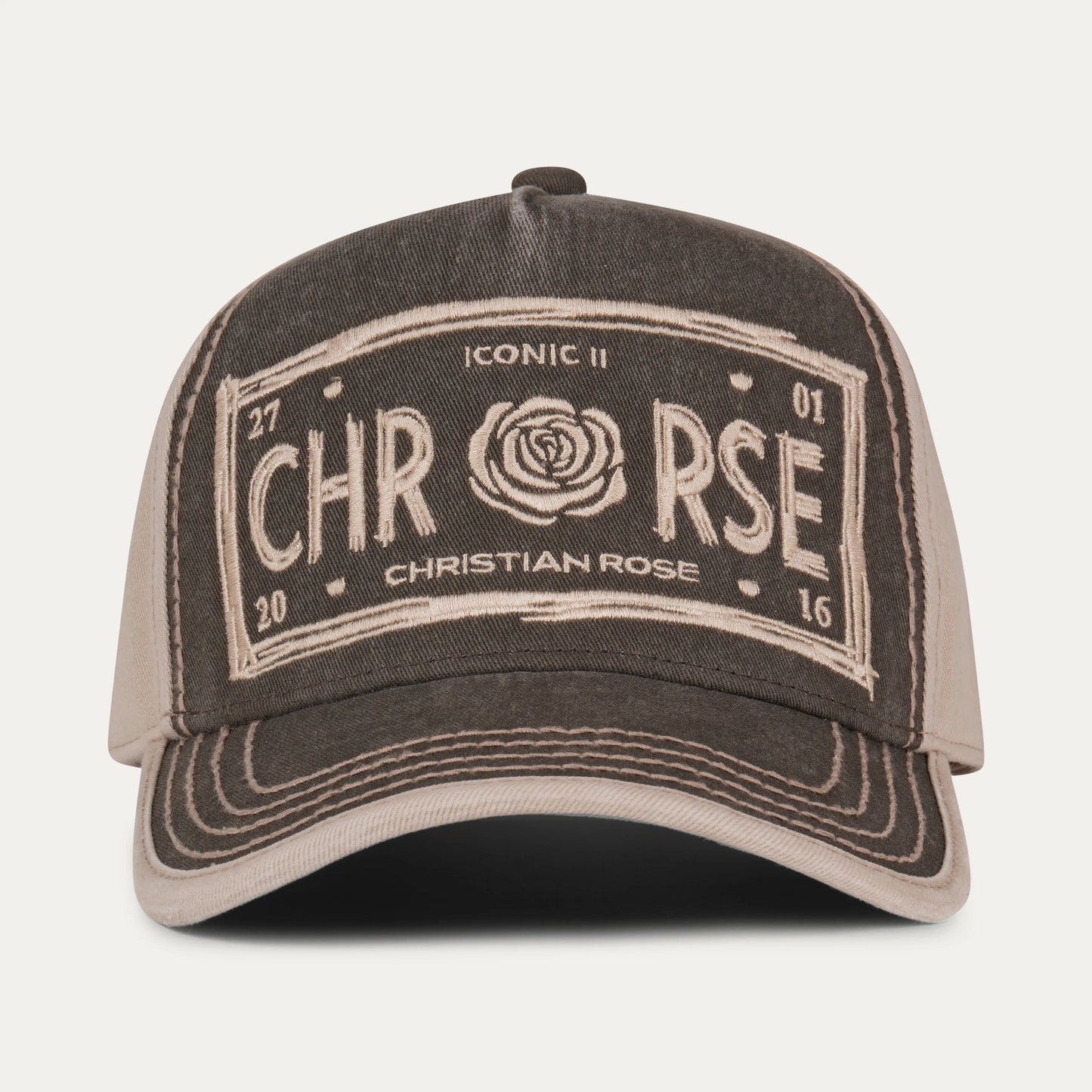 CR033WGC - The Washed Grey / Cream Vintage Sketch Plate Trucker Cap fuses a rugged, lived-in look with refined detailing. Featuring the hand-drawn-style CHR / RSE plate in vintage cream embroidery, this cap blends distressed character with elevated streetwear sensibility.